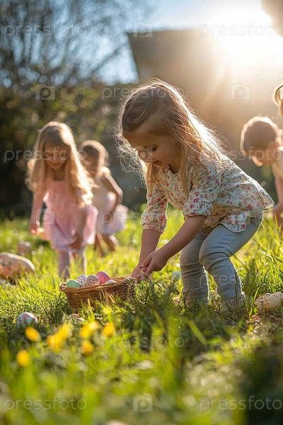Дети участвуют в охоте на пасхальные яйца в солнечном саду