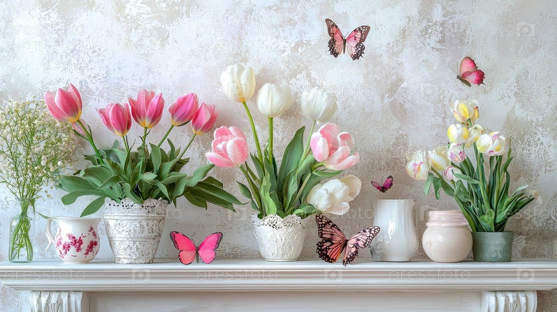 Свежие тюльпаны, бабочки и светлые пастельные цвета Концепция "Счастливая Пасха"