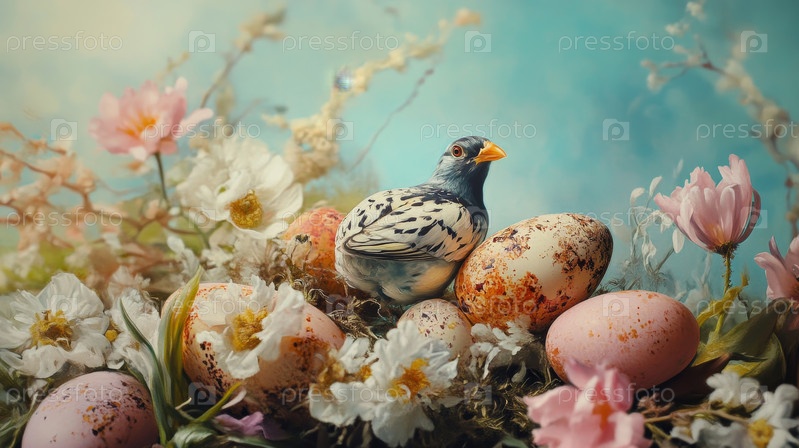 Спокойная и спокойная сцена гнездования с красочными яйцами и очаровательной птицей среди ярких цветов