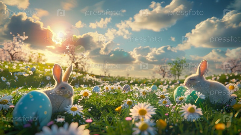 Пасхальный пейзаж, кролики с красочными яйцами и ромашками на лугу под прекрасным небом
