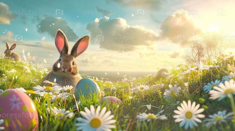 Пасхальный пейзаж, кролики с красочными яйцами и ромашками на лугу под прекрасным небом
