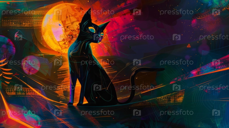 Черная кошка с мистическим фоном, богиня Бастет из Египта