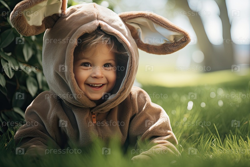 Милый ребенок в костюме пасхального кролика, улыбающийся на фоне солнечной лужайки