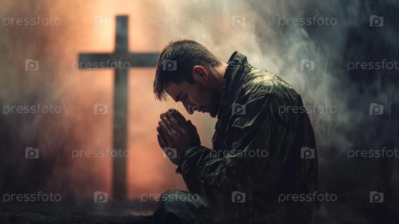 Темная фигура встает на колени в сердечной молитве, мягко освещенной светящимся крестом в прекрасной мистической обстановке