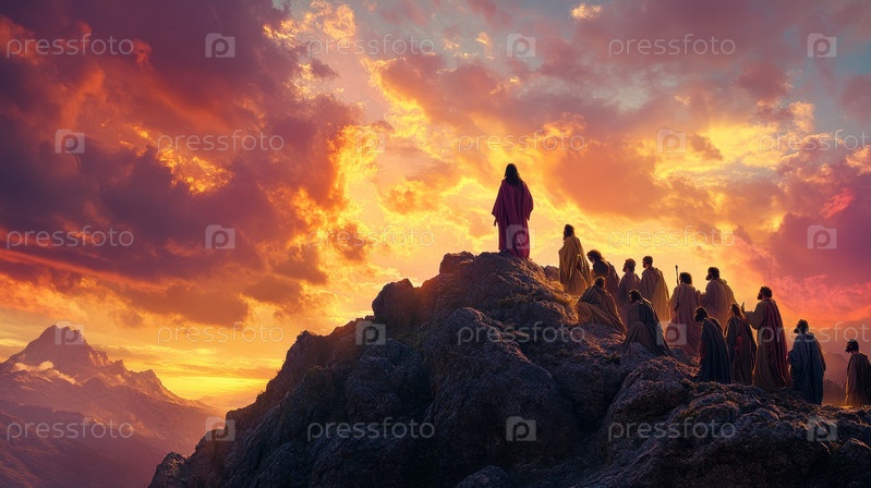 Иисус стоит на горе с учениками против яркого заката солнца, распространяя свое послание веры, надежды и вдохновения