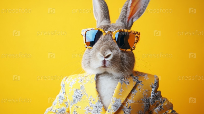 Стильный кролик, уверенно одетый в красочную одежду и шикарные солнцезащитные очки. модный зайчик, одетый в яркую одежду, дополненную модными очками на живом фоне