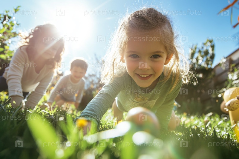 Дети участвуют в охоте на пасхальные яйца в солнечном саду