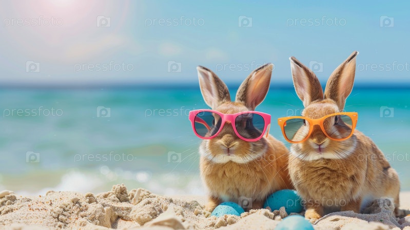 Два милых пасхальных кролика в солнцезащитных очках на отдыхе у пляжного побережья