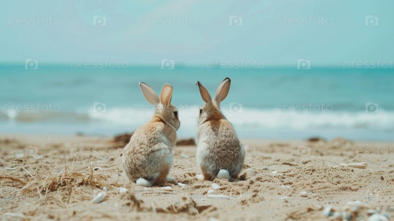 Два милых пасхальных кролика в отпуске на пляжном побережье