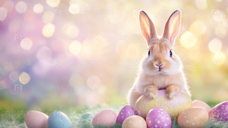 Пасхальная открытка, кролики с красочными яйцами на пастельном праздничном фоне