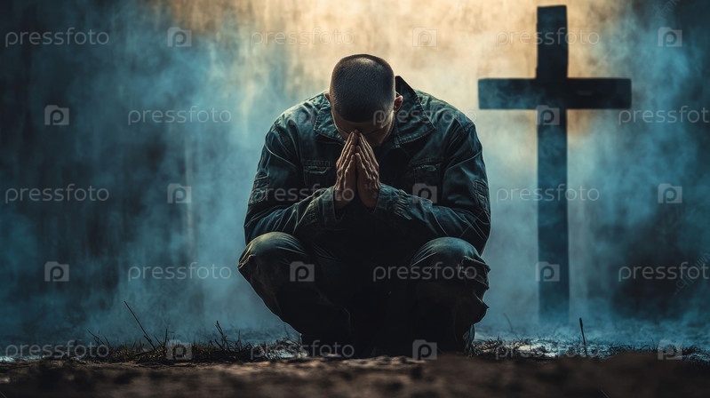 Темная фигура встает на колени в сердечной молитве, мягко освещенной светящимся крестом в прекрасной мистической обстановке