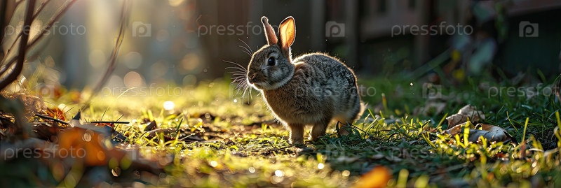 Кролик бежит по газону на фоне солнечной лужайки, на зеленой траве с солнечными лучами