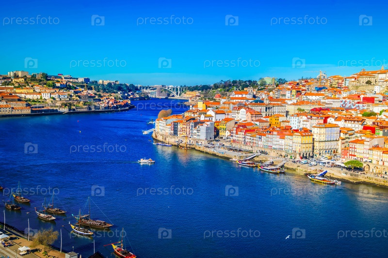 Живописный, красочный вид на старый город Порто через реку Дуро