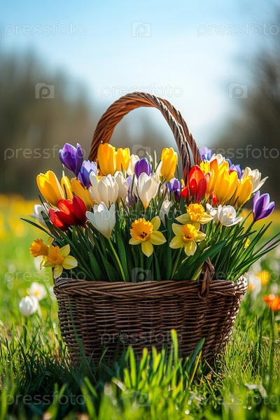 Потрясающе красивая корзина, наполненная до края яркими и красочными цветами в солнечном весеннем поле