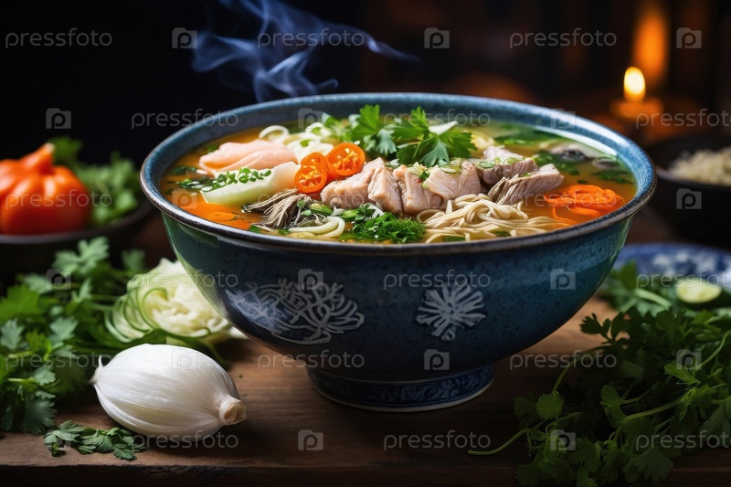 AI генеративный традиционный бирманский суп мохинга в миске ужин обед, овощи вегетарианская кухня