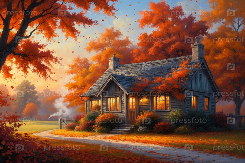 Дом здания ландшафтный фон красные и желтые листья осень-осень осенний лесной парк AI Generative
