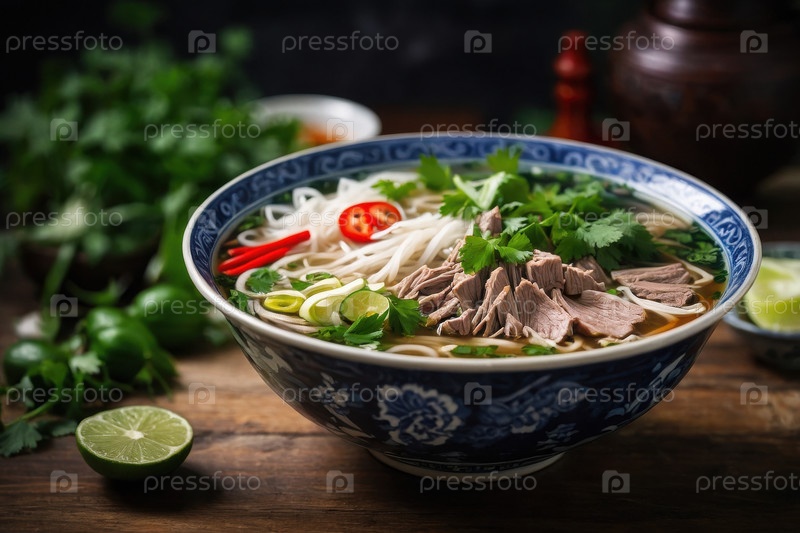 Традиционный вьетнамский фо-бо суп в миске ужин обед, овощи вегетарианская кухня AI Generative