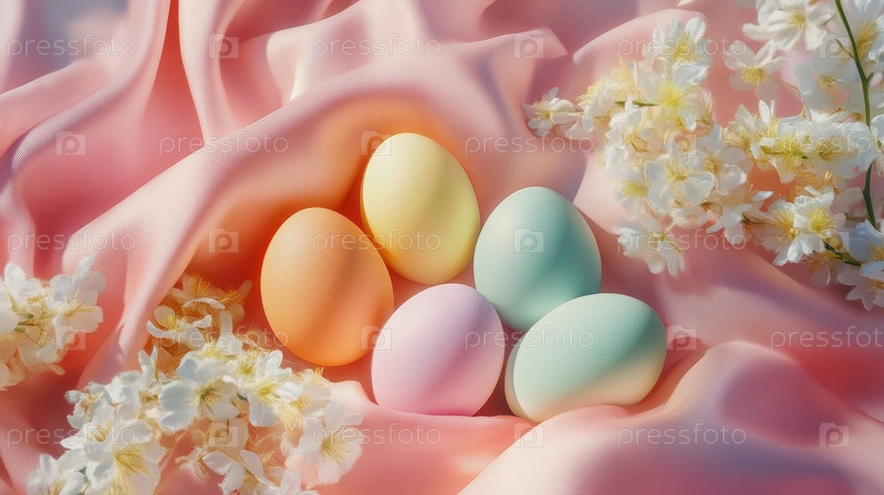 Сладкие воздушные оттенки. мягкие формы зефира на шелковой ткани сложные цветы. бархатные яйца зефира, опирающиеся на гладкую ткань с рассеянными цветами, создающие спокойную атмосферу