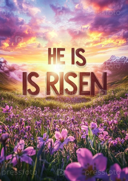 Пасхальный плакат со словами "Он воскрес" большими буквами на фоне