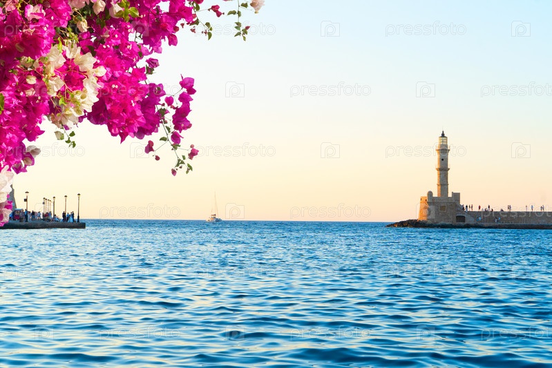 Залив Хании с морем и маяком на солнечном летнем закате, Крит, Греция, формат веб-баннера