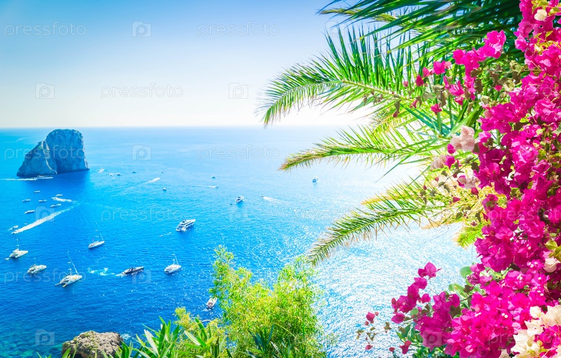 Знаменитые скалы Фаральйони и побережье острова Капри, Италия, ретро-тон