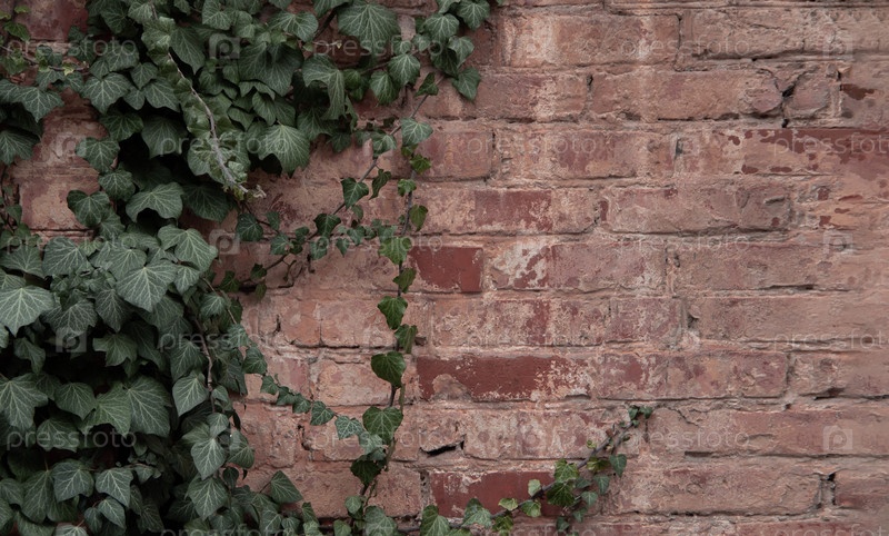Зеленая листва плюща на фоне из красного кирпича