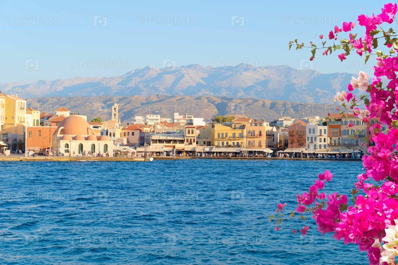 Венецианская гавань Хании с историческими домами в солнечный день, Крит, Греция