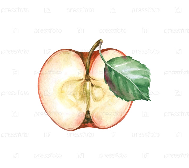 Половина спелого красного яблока с зеленым листьем на изолированном фоне. сочные фрукты в акварели. реалистичный ботанический клипарт для меню, варенья, детского питания и урожая
