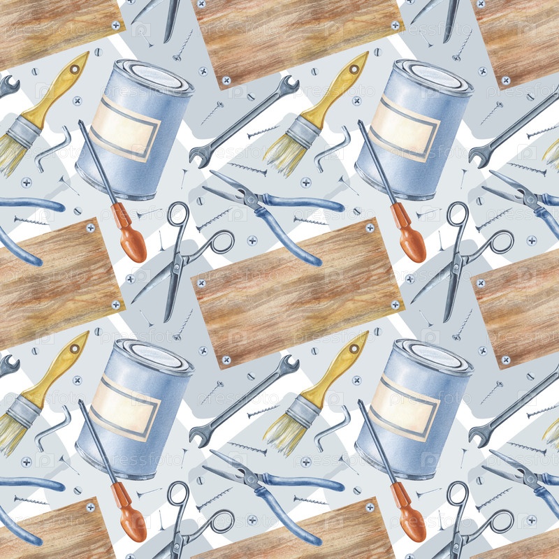 Бесшовный рисунок с рабочими инструментами и деревянной доской на фоне полупрозрачных силуэтов баночек. Акварельная иллюстрация мужских рабочих инструментов для ремонта дома на изолированном фоне. Реалистичный повторяющийся шаблон для дизайна упаковки, ре
