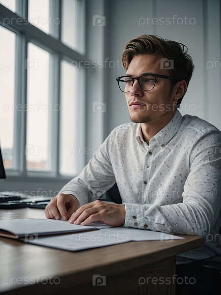 Офисный сотрудник в белой рубашке и очках, работающий на ноутбуке за столом, уход за зрением, профессиональное консультирование, очки, современное корпоративное рабочее пространство, производительность бизнеса