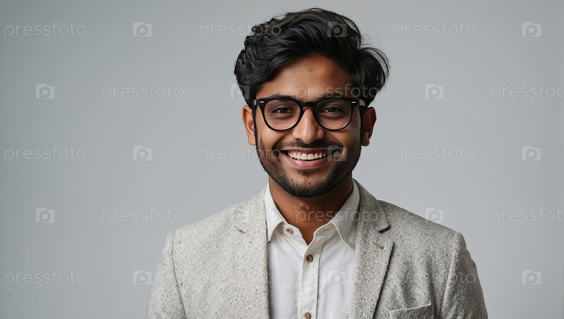 Уверенный молодой южноазиатский мужчина в очках, студийный серый фон, современный стиль, визуальный комфорт, близорукость от использования компьютера, студенческая жизнь, пустая зона баннера для текста