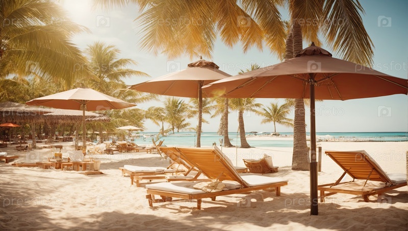 Реклама пляжа с соломенными зонтиками, мягкими шезлонгами, развлечениями, солнцезащитой, семейным отдыхом, профилактикой ожогов, продвижением туров