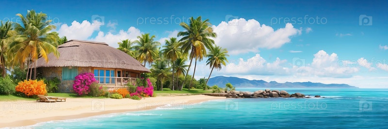 Пальмовый бунгало на песчаном пляже, жилье в частном курорте, индивидуальный комплекс "все включено", реклама тура, стиль цифрового рисунка