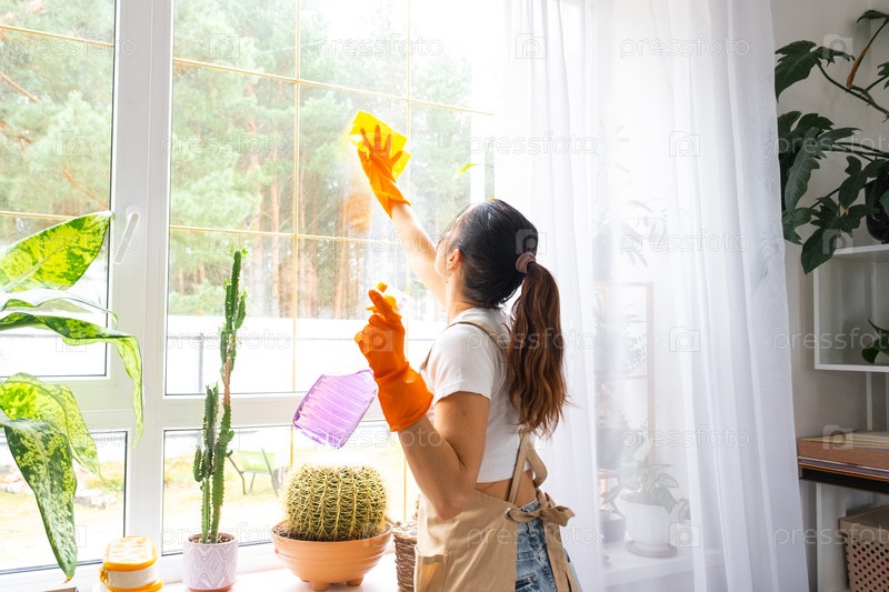 Женщина убирает окно, повседневные дела, современный дом, чистящие принадлежности, перчатки и фартук, растение в окне, промо-промо компании по уборке, экологический образ жизни