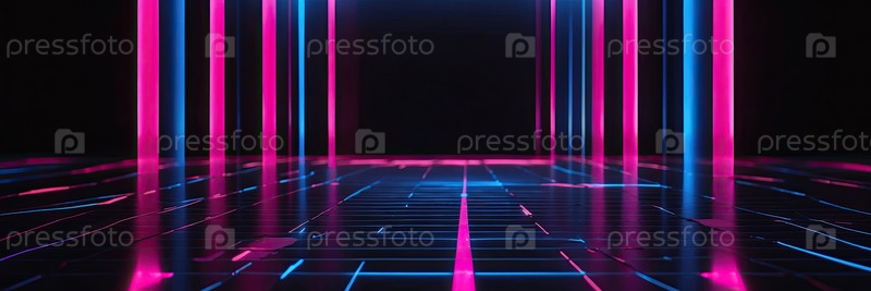 Абстрактный цифровой фон с вертикальными неоновыми голубыми розовыми полосами, светящимися линиями, минимальным научно-фантастическим макетом, кибер шаблоном для баннеров или технологических презентаций