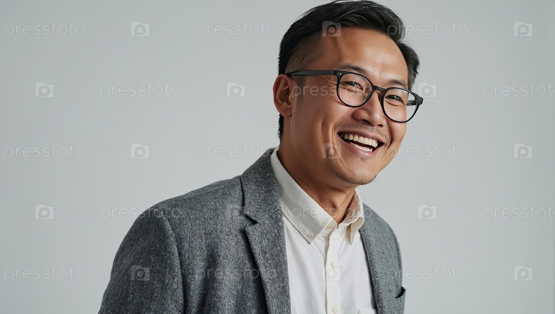 Мужчина средних лет из Азии в очках, серый костюм, студия, улыбающийся, белый фон, усталость от зрения, потеря зрения у взрослых, адаптация очков, консультирование, копирайтинг
