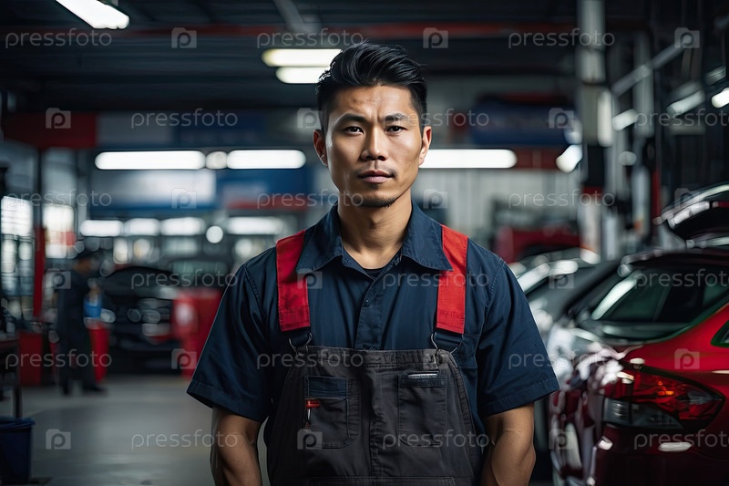 Портрет азиатского мужчины-автомеханика в синей и красной форме на автосервисе, серьезный работник, автомобильный техник, профессиональный персонал, текстовое пространство
