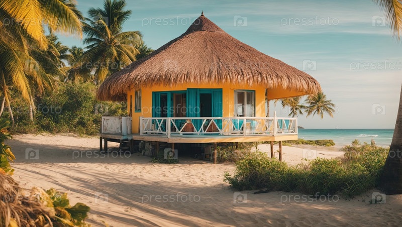 Бунгало с голубой соленой крышей у воды, люкс "все включено" для пар, реклама курорта, платформа хостинга, иллюстрация, стиль акварели