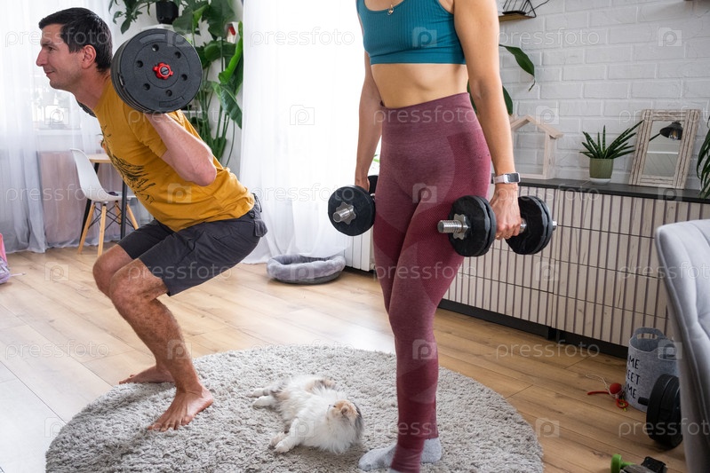 Fit duo поднимает гантели и штанги дома, дружелюбный кот на ковре, современная квартира, домашняя тренировка, поддерживающая фитнес-система, здоровый образ жизни