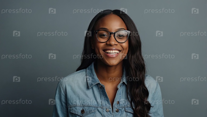 Афроамериканская девочка-подросток с легкими очками, полуулыбка, синий фон, модное афро, расслабленная атмосфера. коррекционное уход, внимание к деталям, цифровые брошюры, здоровый образ жизни, школьный ресурс