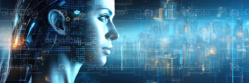 Лицо женщины, сливающееся с цифровым интерфейсом, синий неоновый цикл кибер-фон, ИИ интеллект, левое пространство копирования для информационного или брендингового текста
