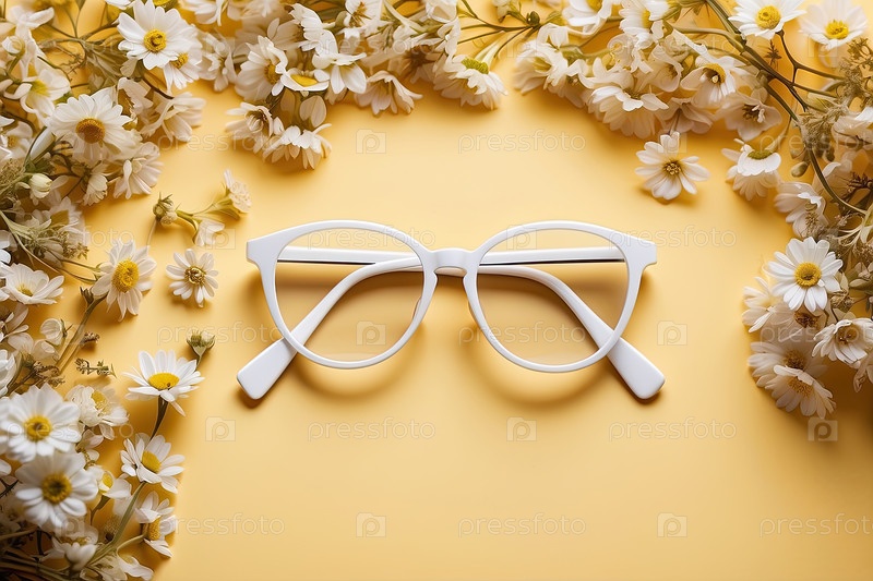Белые очки с ромашками на желтом фоне, высокая летняя оптическая концепция, свежая мода для оптика или магазина очков, шаблон с цветочным стилем и пространство для текста