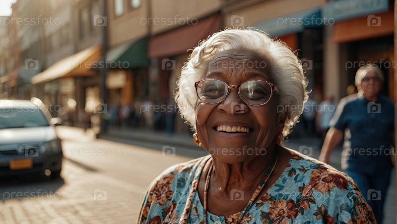 Улыбающаяся пожилая чернокожая леди в любимых очках, коричневый свитер, сумерки города, счастливое лицо. катаракта, пресбиопия, проблема с бликами, отзывы о клинике оздоровления, медицинская графика, информационная реклама