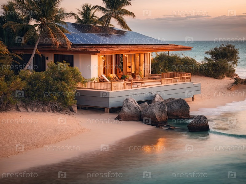 Тропическая курортная вилла с солнечными панелями крыши, экологическое жилье на берегу моря, возобновляемая энергия, зеленый туризм, цифровая иллюстрация мультфильмов
