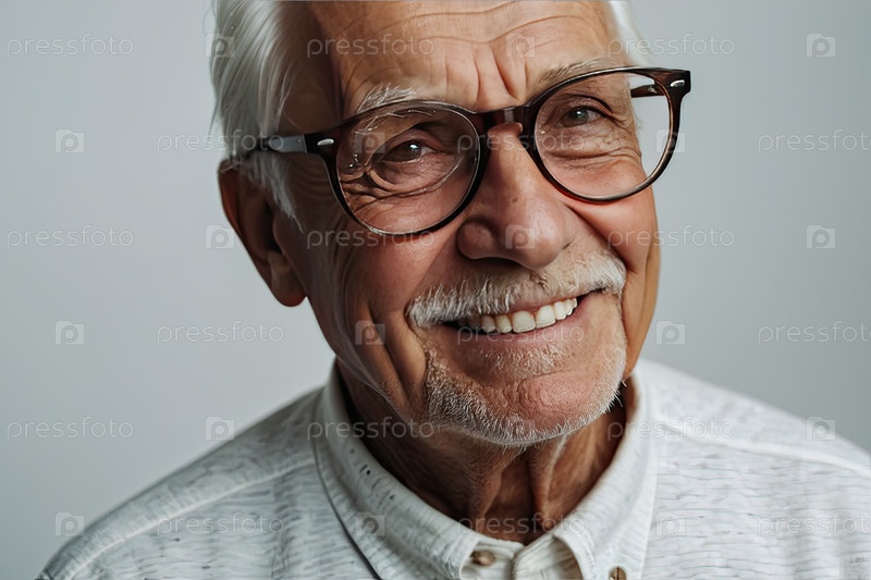 Старший индийский мужчина в очках, серый фон, нежная улыбка, представляющая охрану здоровья глаз, терапию катаракты, продвижение здорового старения, осознание зрения, текстовый баннер