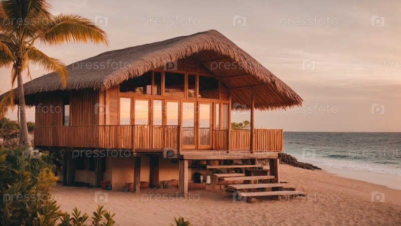 Стильный деревянный бунгало на пляже над водой, тропический отдых со всем включенным, поездка для семей, иллюстрация туристической брошюры