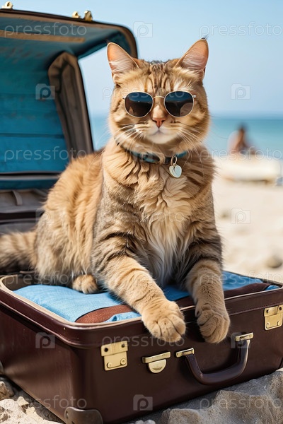 Кошка в чемодане, авиаперевозки животных, отель с домашними животными, риски перегрева, временное размещение питомца на борту, туристическая брошюра или использование веб-сайта
