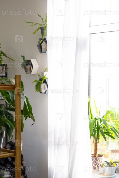 Минималистский яркий интерьер с горшковыми растениями, большим окном, естественным светом, легким стилем, декоративной полкой, оборудованием для окон, воздушной атмосферой, дизайнерским использованием