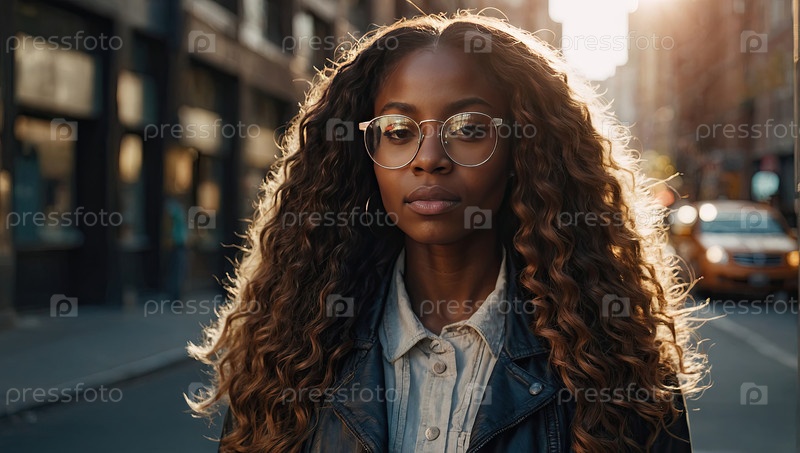 Афроамериканская девушка в модных очках, большие кудрявые волосы, открытый городской фон, откровенность. коррекция зрения, предпочтение круглой рамы, урбанистическая молодежная мода, социальные сети, вставка текста