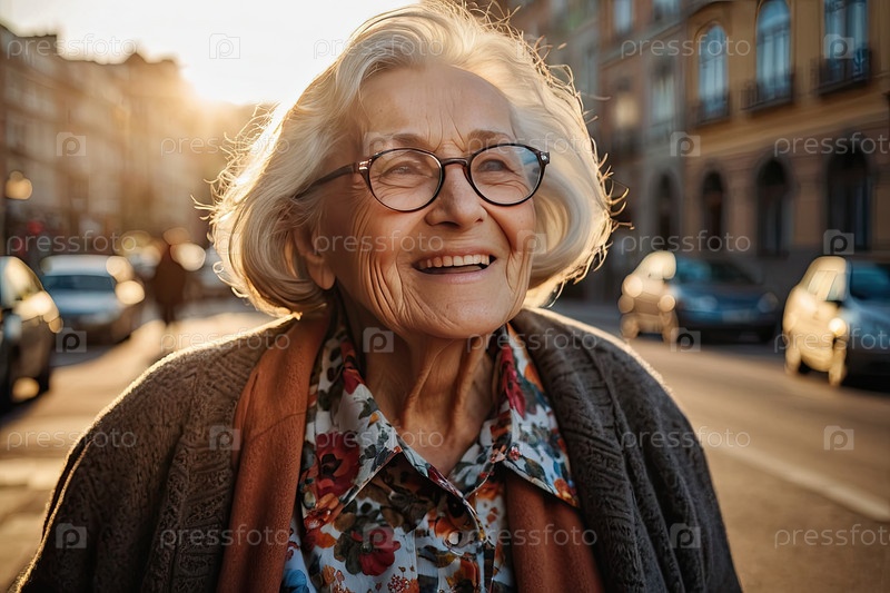 Веселая пожилая кавказская женщина в круглых очках на городском тротуаре, способствующая здоровому старению, защите зрения, теме глаукомы и катаракты, городской открытый баннер, текстовая зона